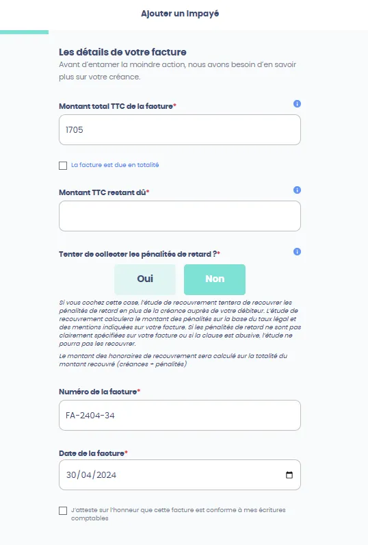 • lorsque la facture à recouvrer est de type B2B (le débiteur est une société), il est obligatoire d’envoyer le Siren de la société débitrice.