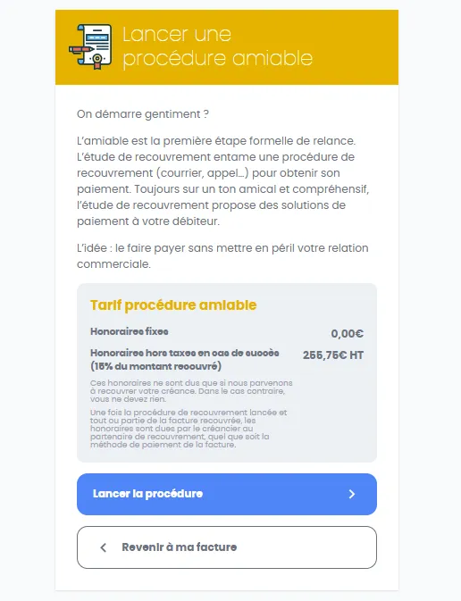 Sous 48 heures ouvrées, à compter du lancement de la procédure, votre statut passe en “Amiable”. L’étude d’huissiers prend toutes les actions nécessaires afin de satisfaire au mieux votre demande.