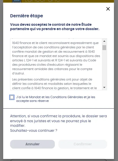 4. Validez les honoraires (au succès uniquement) et le mandat de l’étude de recouvrement